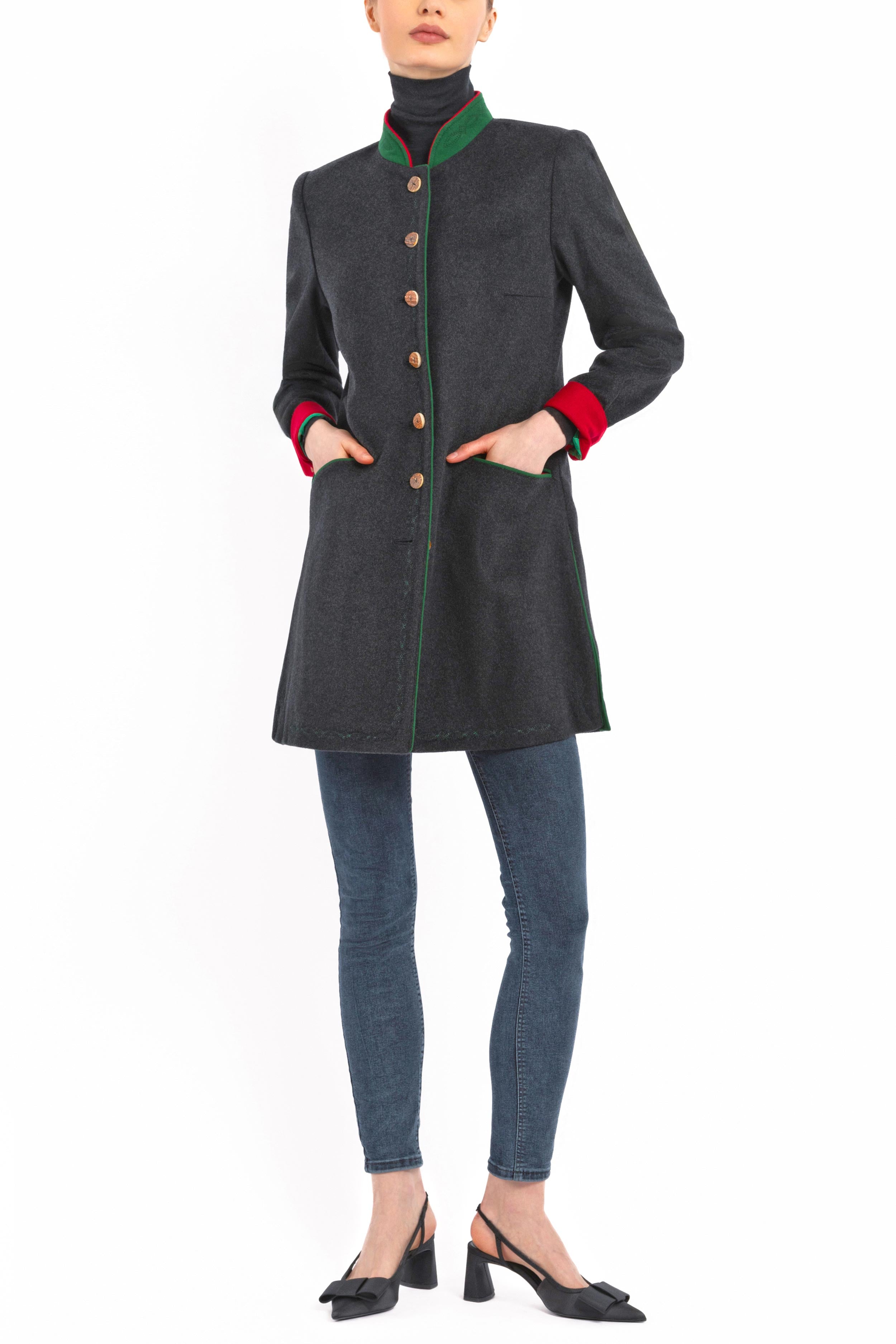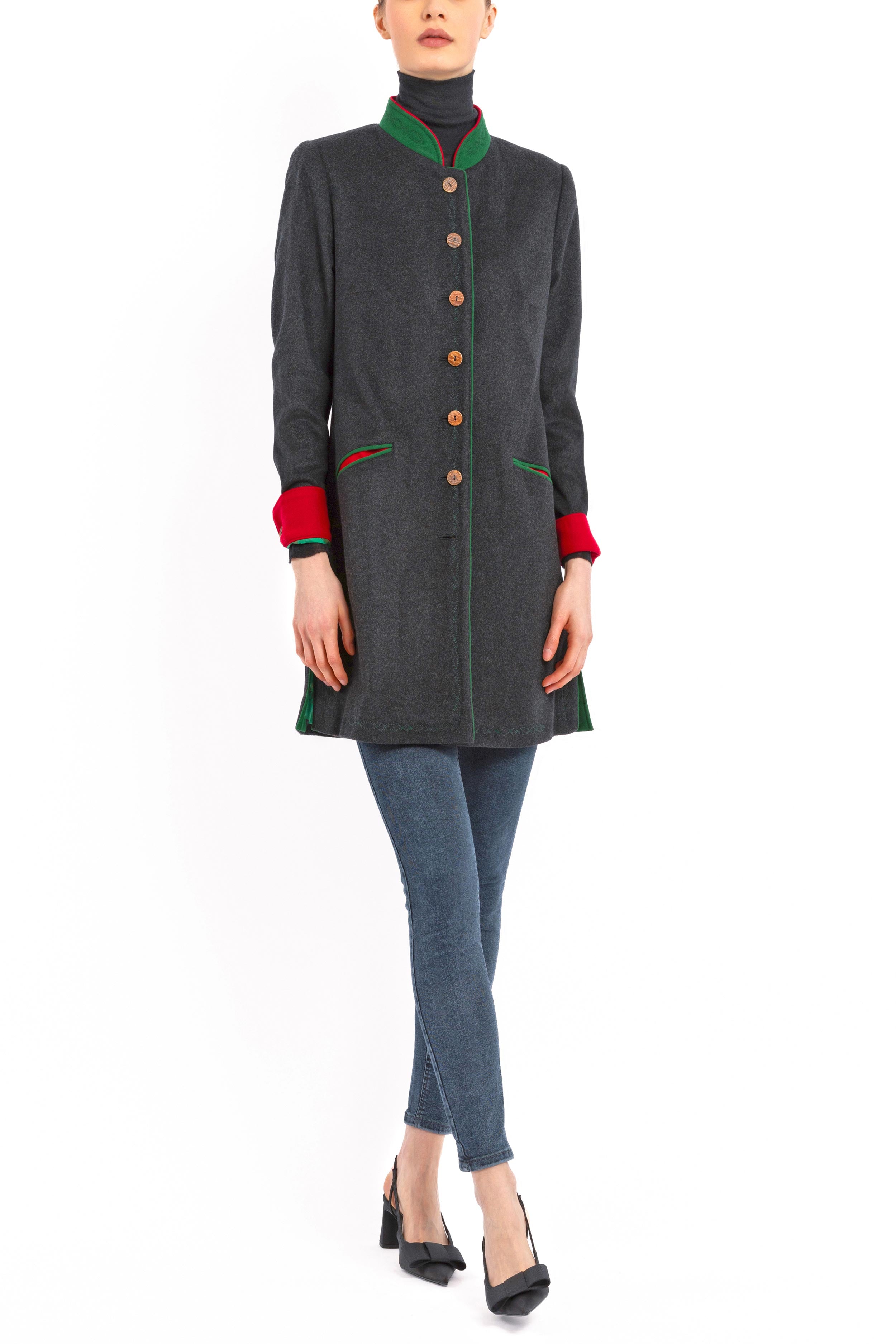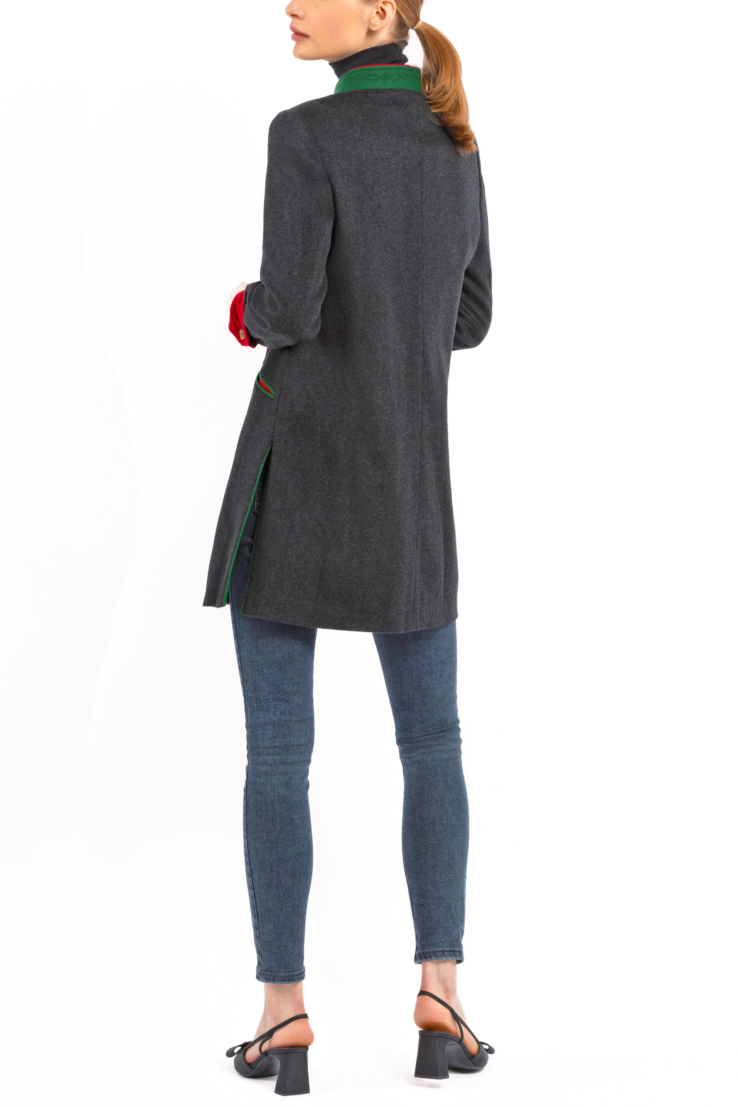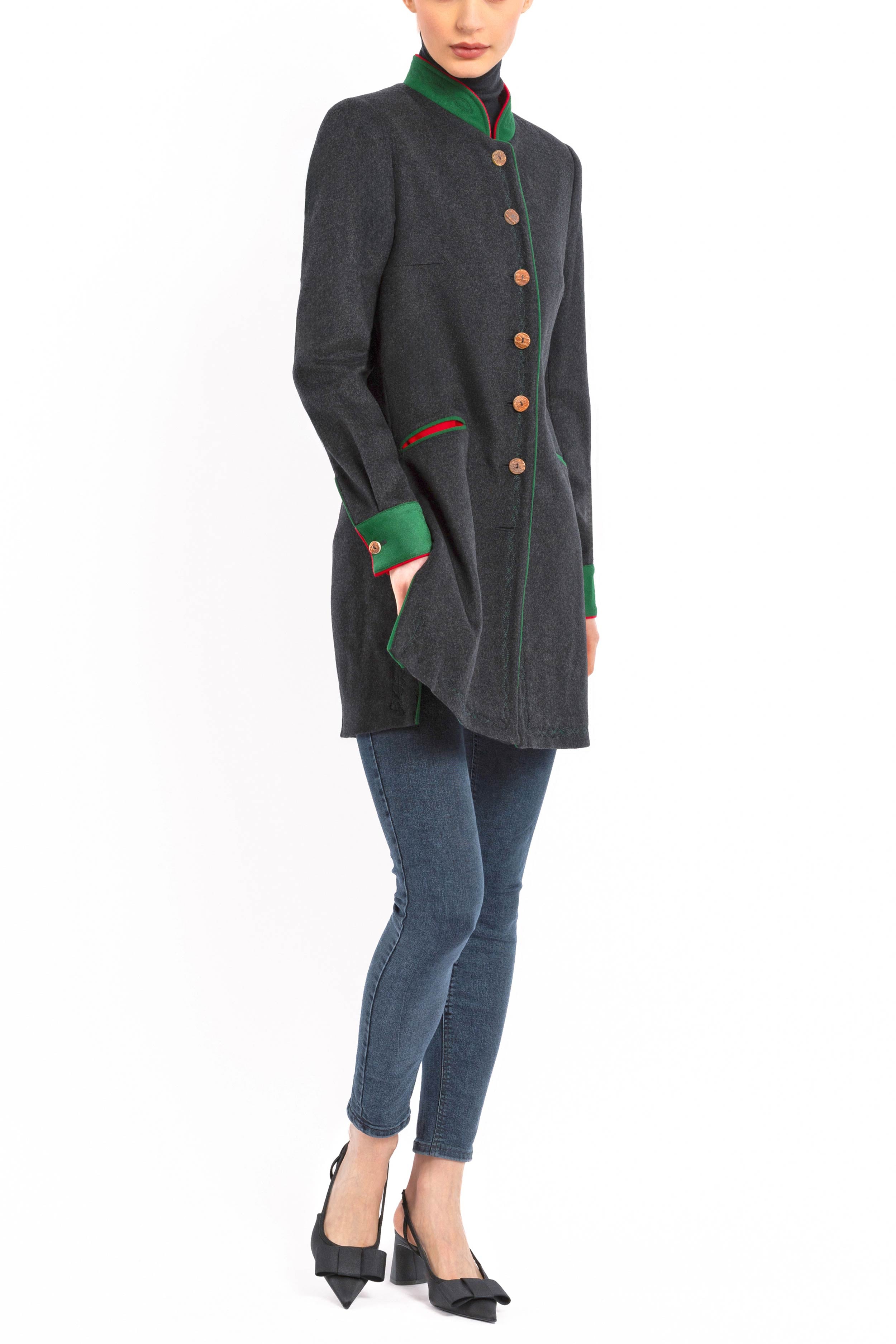Long, casually tailored blazer crafted from finest anthracite Cashmere-Loden made of 100% Italian cashmere. The clean, slightly fitted silhouette with two side vents combines modern elegance with traditional detailing. The stand-up collar in green Loden with a red inner collar adds refined contrast.