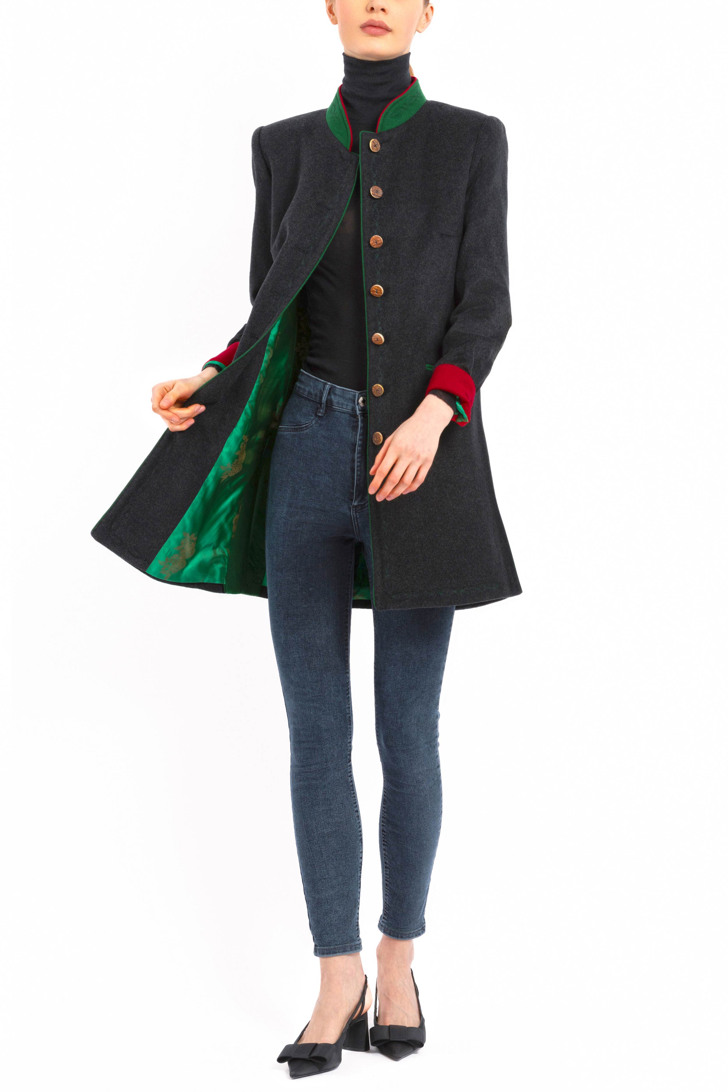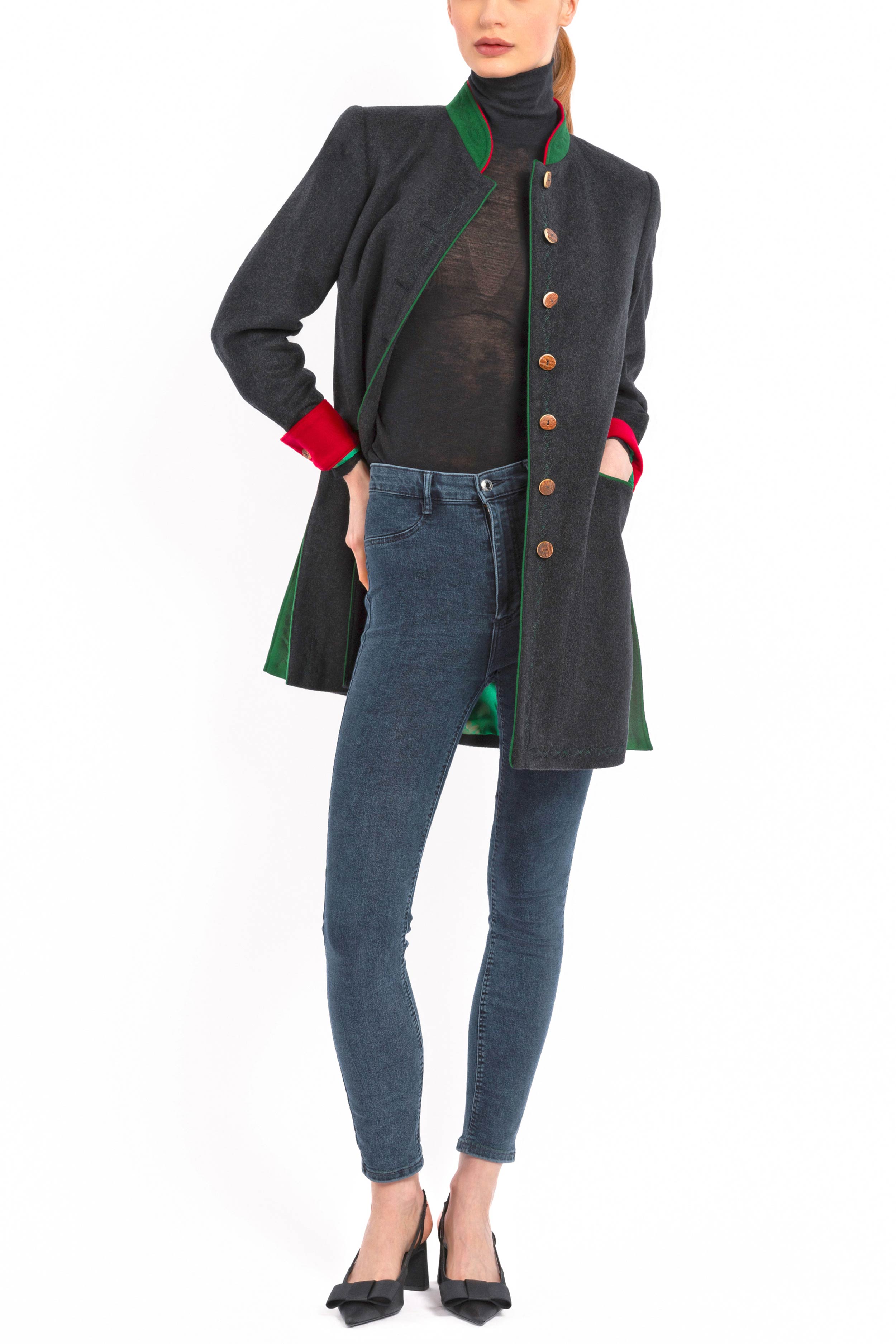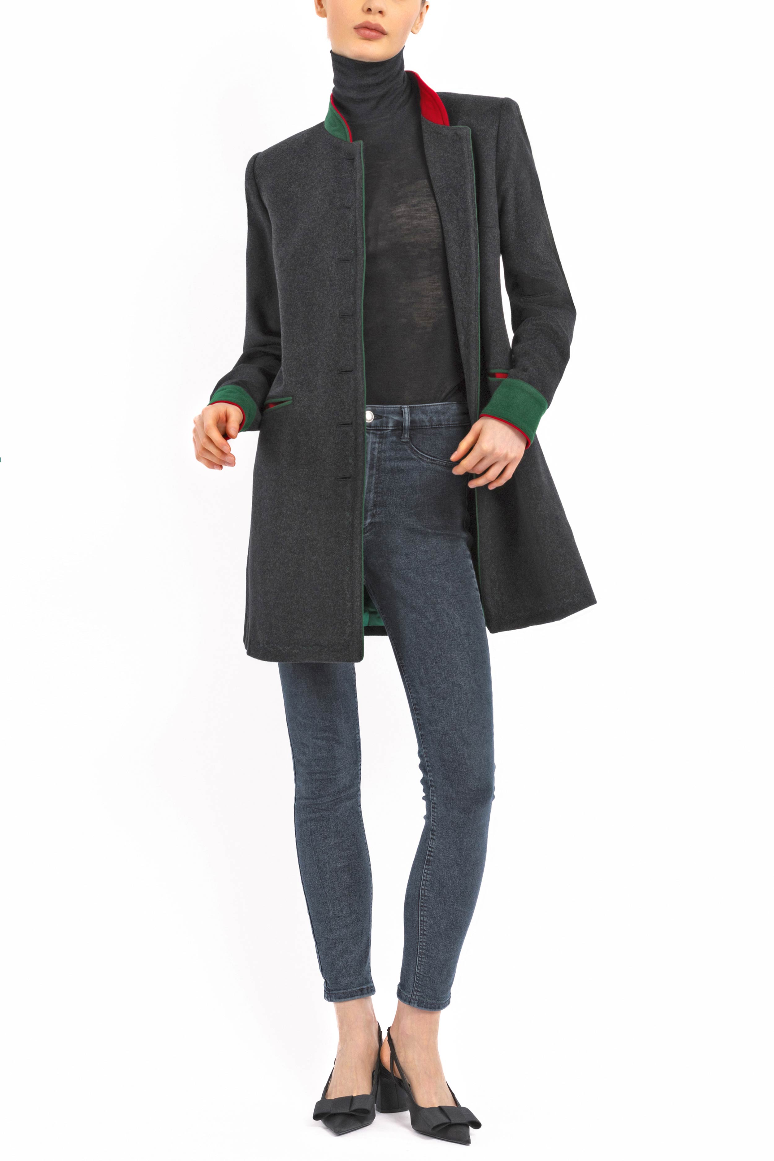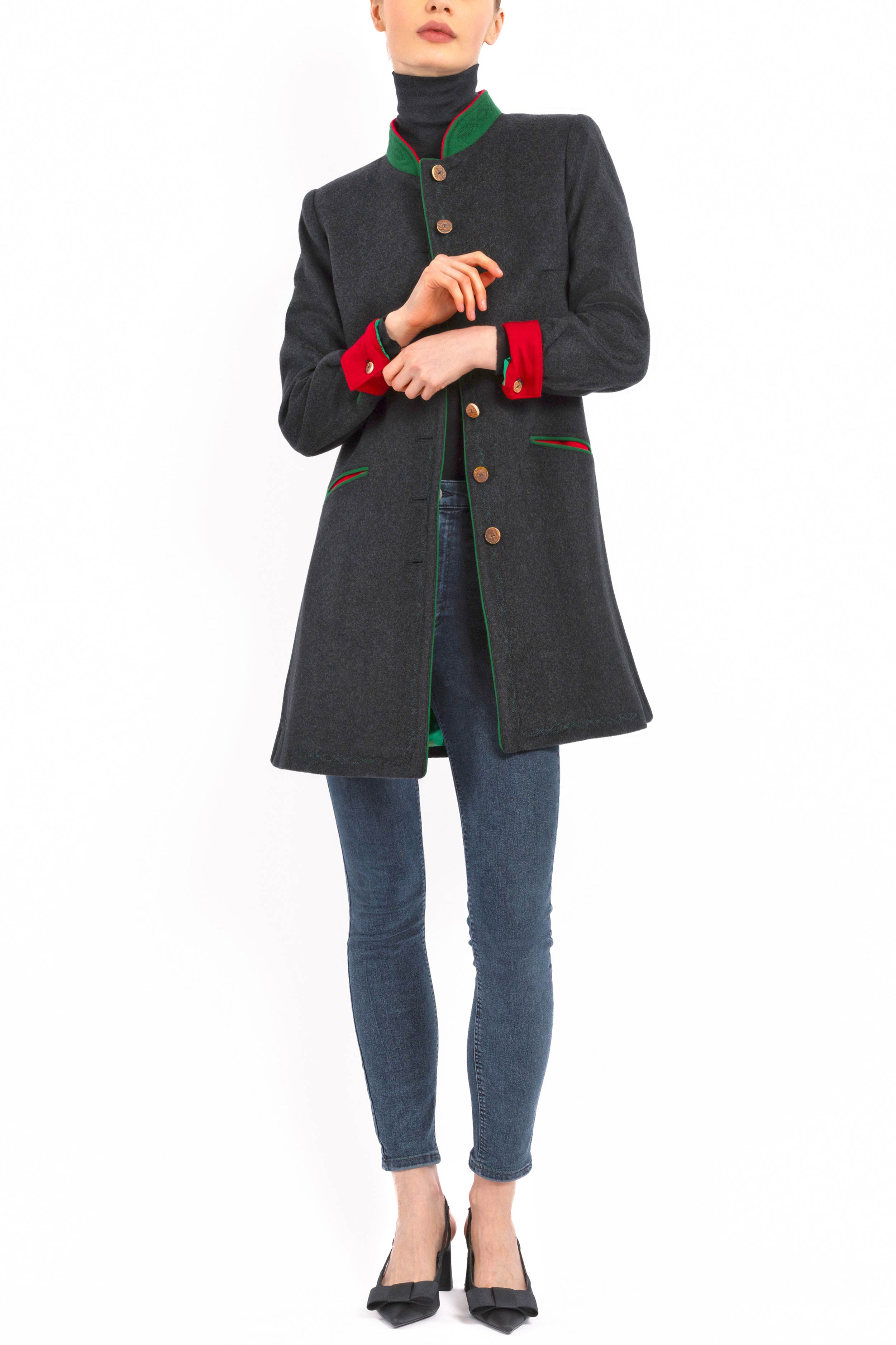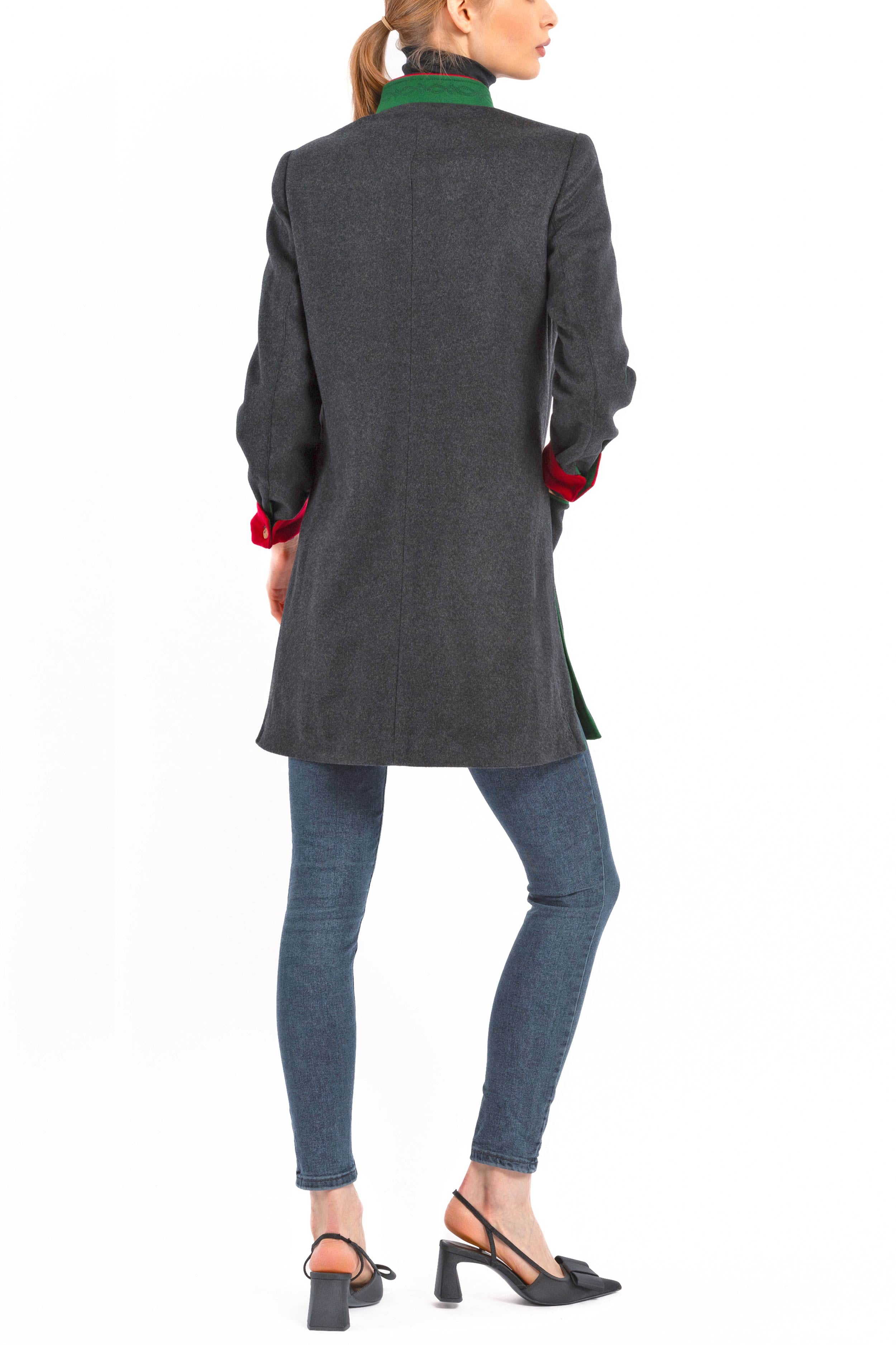 Long, casually tailored blazer crafted from finest anthracite Cashmere-Loden made of 100% Italian cashmere. The clean, slightly fitted silhouette with two side vents combines modern elegance with traditional detailing. The stand-up collar in green Loden with a red inner collar adds refined contrast.