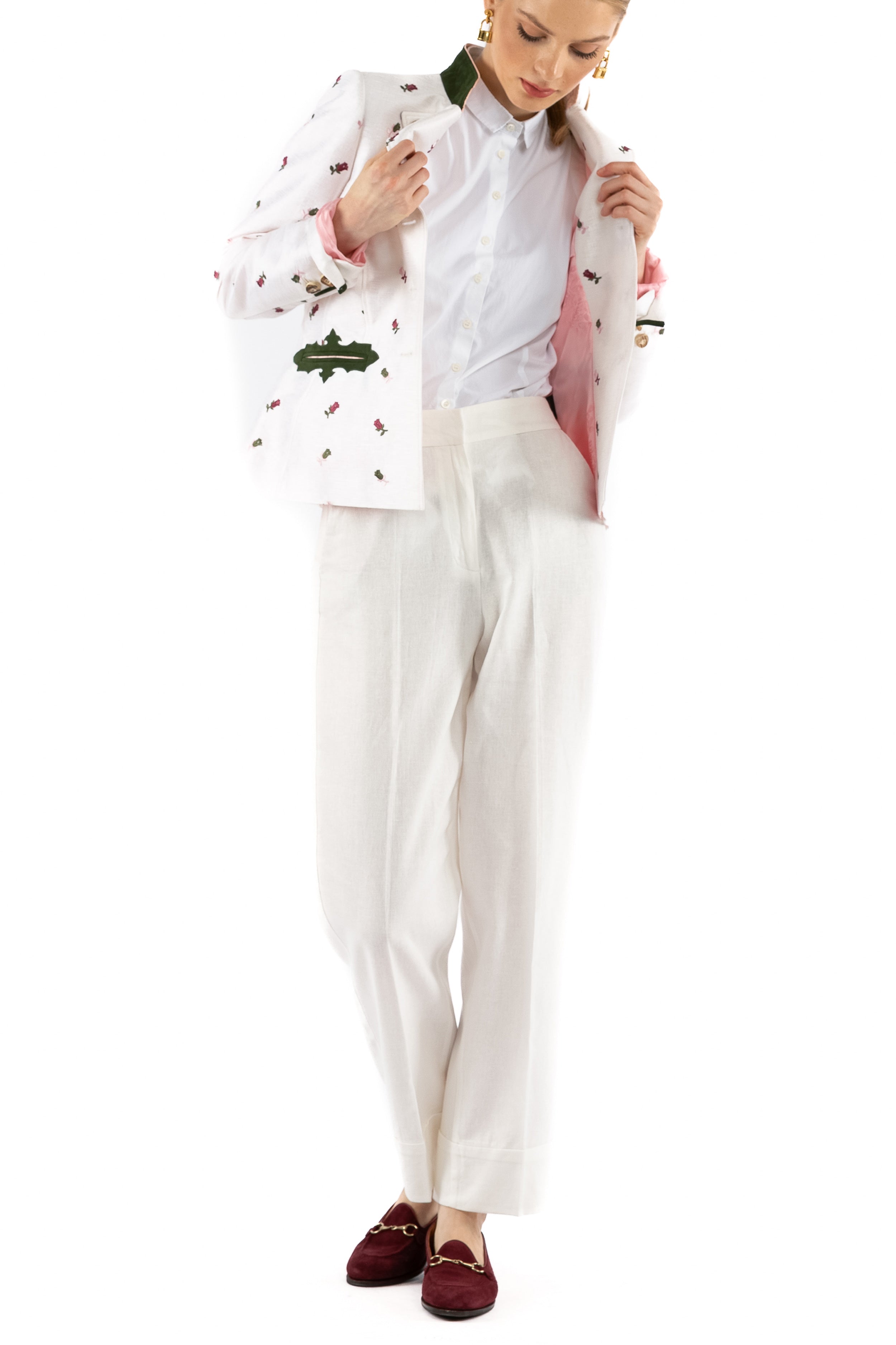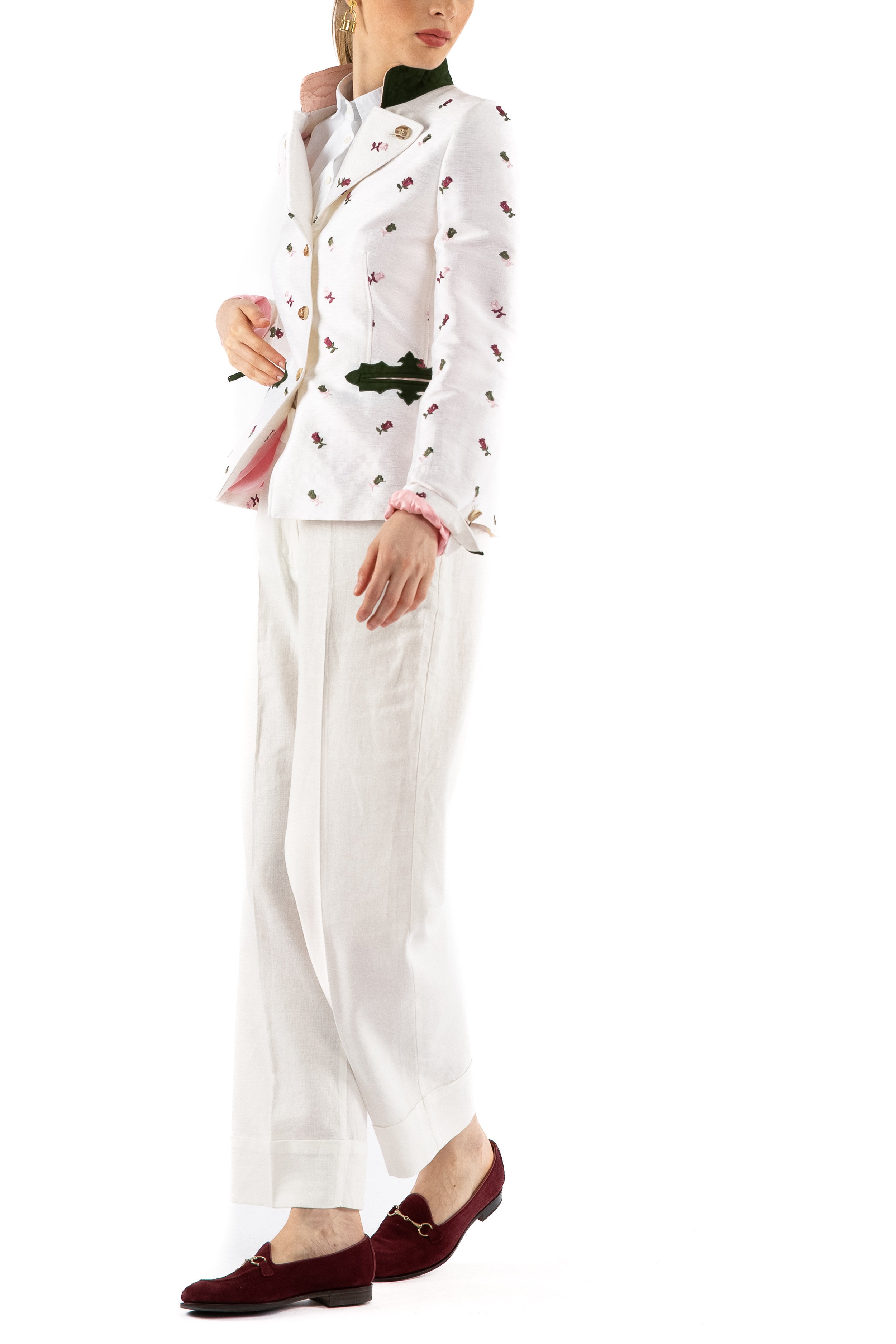 This tailored Bavarian blazer with classic lapels is slightly flared over the hips, creating a clean and feminine silhouette. Crafted from fine ChapSilk in off-white, the fabric is embroidered with delicate roses distributed across the surface. The small embroideries in burgundy and green add a subtle ornamental texture and emphasise the artisanal character of the piece.